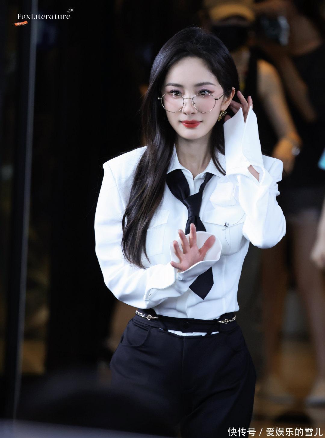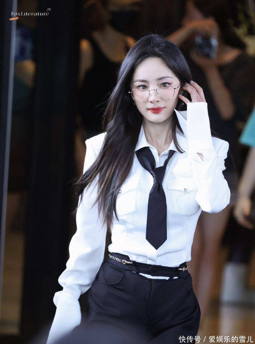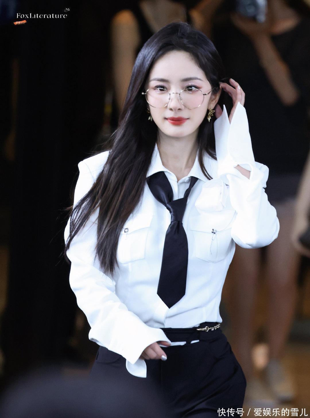 一直以来,杨幂在大众心中的形象丰富多样,有少女感十足的,有优雅妩媚的。而这次她以白衬衫、黑领带搭配金丝眼镜的造型出现,成功解锁了 “甜飒女精英” 的新人设,带来满满新鲜感。