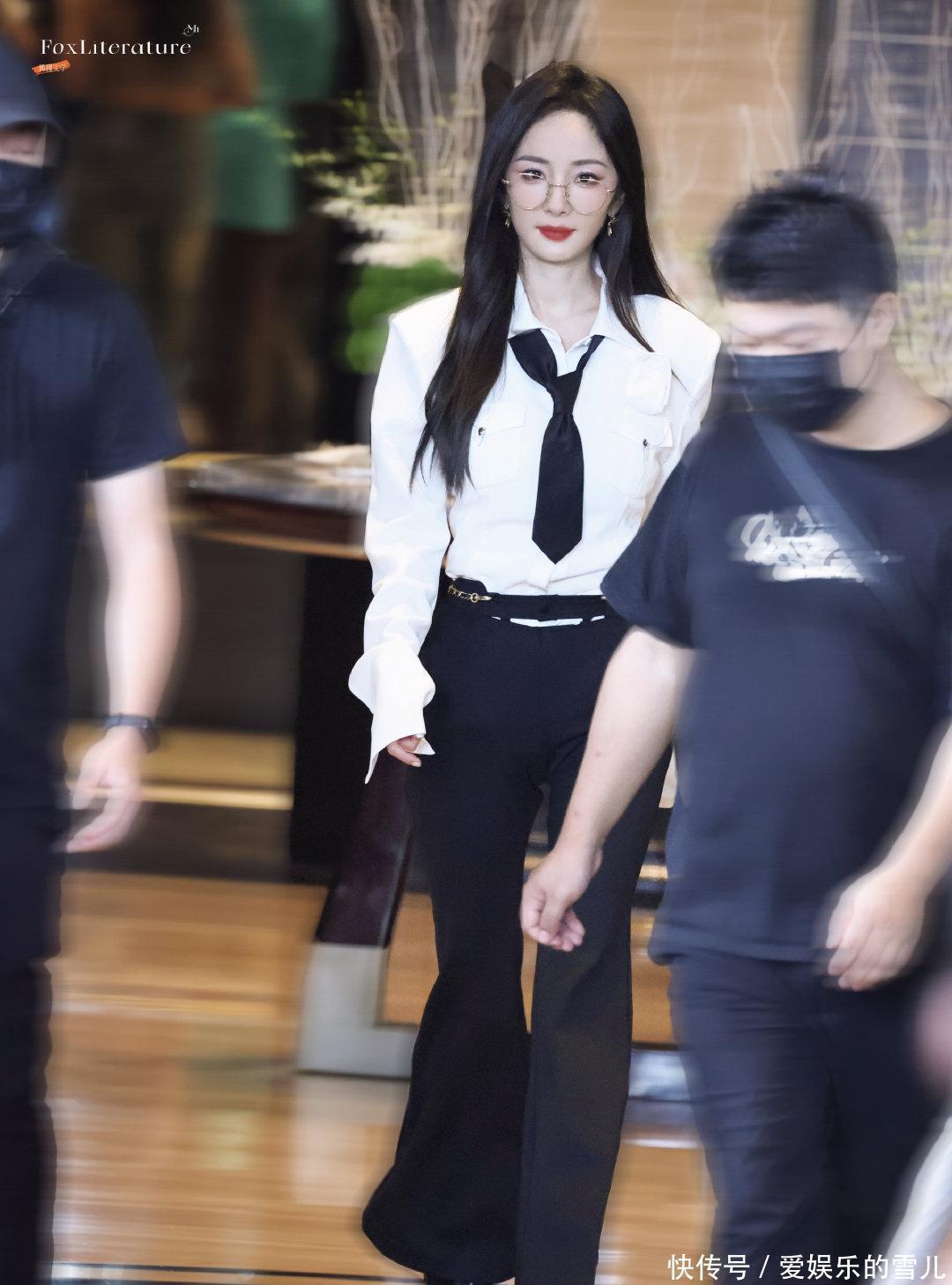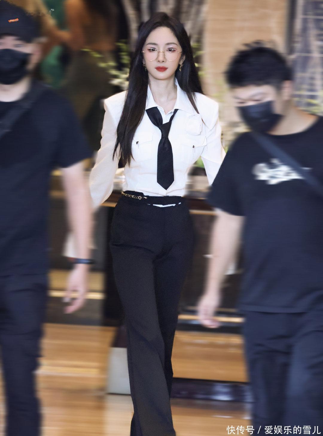 先看造型,白衬衫的材质挺括,穿着起来很有质感,领口的设计简洁大方。黑色领带的加入,瞬间增加了职业感和利落感。裤子是黑色喇叭裤,修饰腿型的同时,也让整体造型更具复古韵味。腰间的金属链条腰带,为整体造型增添了时尚感和精致感。金丝眼镜则为她增添了一丝文艺气息,与整体的飒爽形成了巧妙的平衡。对比杨幂以往的风格,这次的造型少了些柔美,多了些硬朗。她过往的穿搭有时会偏向于展现女性的曲线美,而这次的穿搭更注重线条的利落感。这种转变,让她从以往的风格中跳脱出来,塑造出一个既甜美又飒爽的女精英形象。这和她的年龄、气质也很契合,30 + 的女性本就可以有多种风格,这种甜飒的女精英形象展现了她的多面性。当她穿着这身造型出现在公众视野时,就像一位年轻有为的女高管,自信从容地穿梭在商务场合,既有着女性的魅力,又有着职场的干练。不少粉丝表示,很喜欢杨幂这次的新人设,觉得她驾驭得很好。这也说明,这次的造型成功地为她的人设带来了新的可能性,让大家看到了她在时尚和人设塑造上的不断探索。